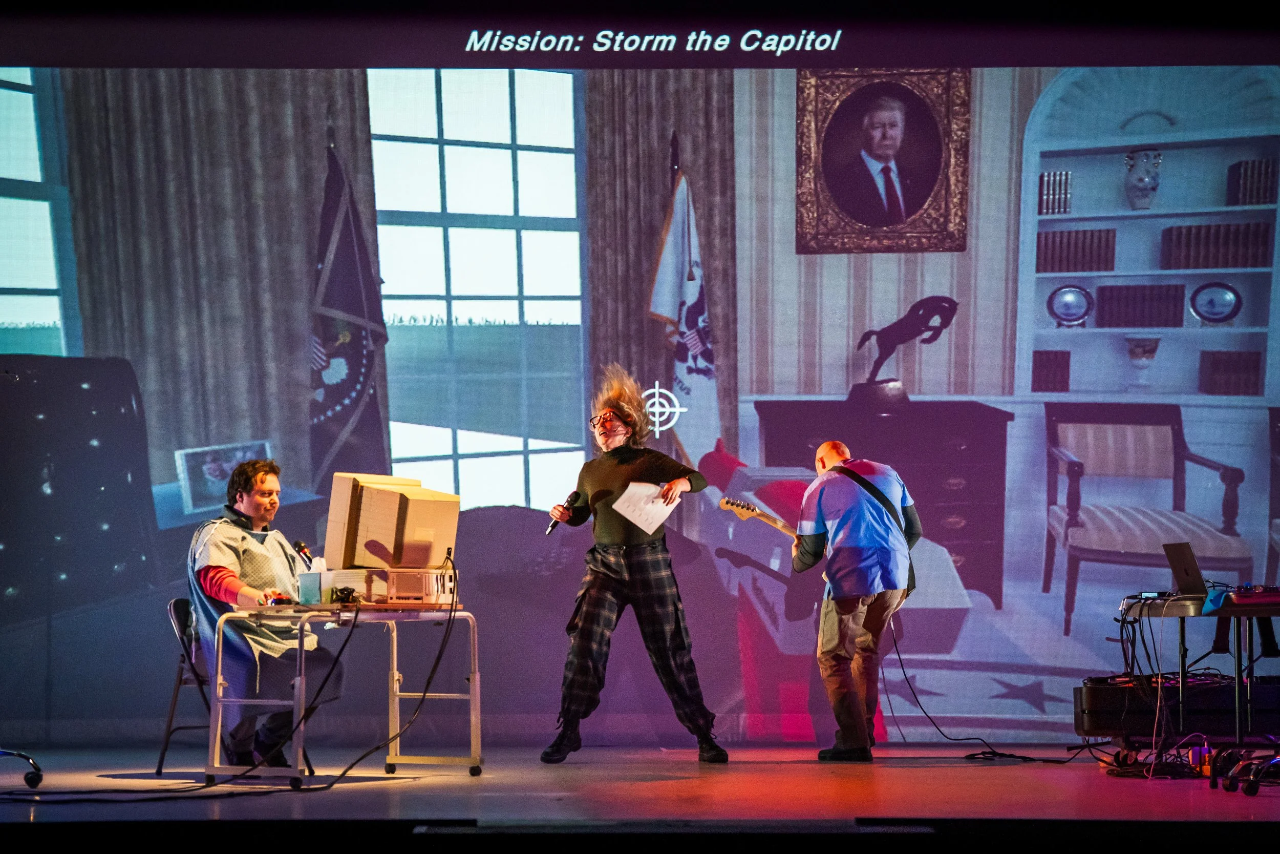 A video game about a dying man navigating an American Hospital in attempt to find a technology to live forever. Narrated by the man’s real daughter, the show brings together material artifacts, game design, live music, and AI to reflect on what it means to be truly (a)live and how to give dignity in death to those we fundamentally disagree with.